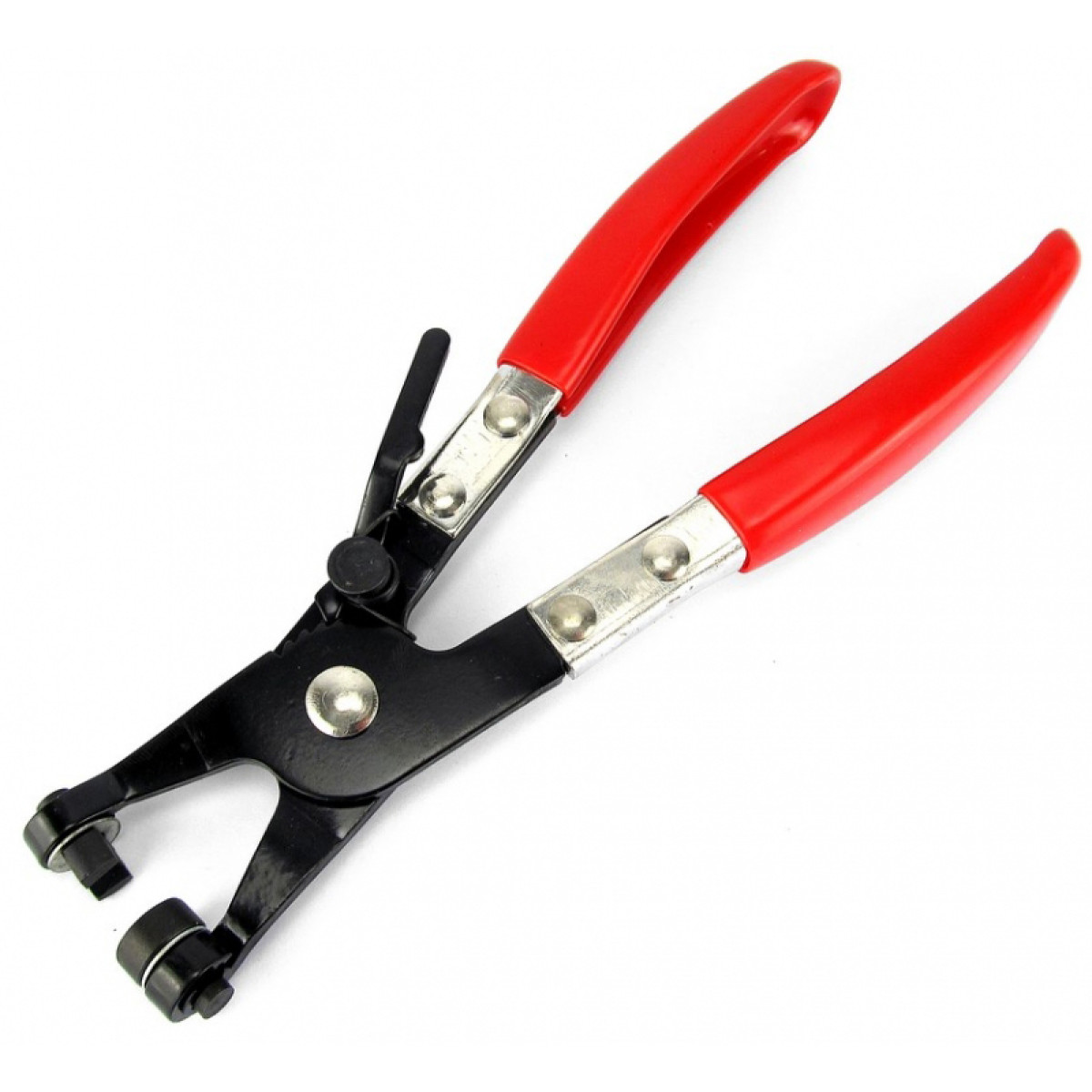 Кліщі призначені для роботи з пружинними шланговими хомутами, які використовуються в системах охолодження, змащення та паливоподачі автомобіля. Інструмент забезпечує надійне захоплення та зручність під час зняття або встановлення хомутів у важкодоступних місцях. Конструкція оснащена поворотними захватами з прорізами, що дозволяють надійно утримувати кінці хомута під будь-яким кутом. Кліщі мають стопорний важіль відкривання з храповим механізмом, який утримує хомут у стиснутому стані та полегшує роботу майстра. Інструмент виготовлений із міцного металу з антикорозійним покриттям, а рукоятки мають прогумоване покриття для зручного захоплення.