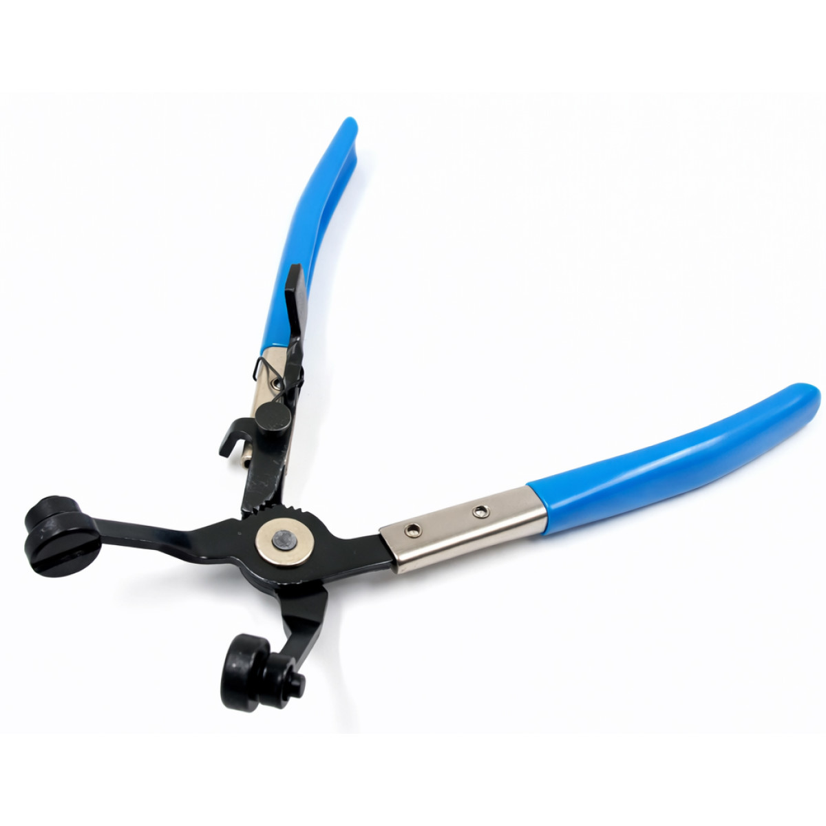 Кліщі призначені для зняття та встановлення пружинних шлангових хомутів у важкодоступних місцях автомобіля. Інструмент використовується під час обслуговування систем охолодження, паливних та масляних магістралей. Вигнута форма робочої частини під кутом 110° дозволяє обходити перешкоди у підкапотному просторі та зручно працювати у місцях з обмеженим доступом. Поворотні губки забезпечують надійне захоплення хомута під різними кутами. Кліщі оснащені стопорним важелем з храповим механізмом, який фіксує інструмент у стиснутому положенні та полегшує роботу майстра. Інструмент виготовлений із зносостійкої сталі з антикорозійним покриттям, а ергономічні рукоятки забезпечують зручний хват.