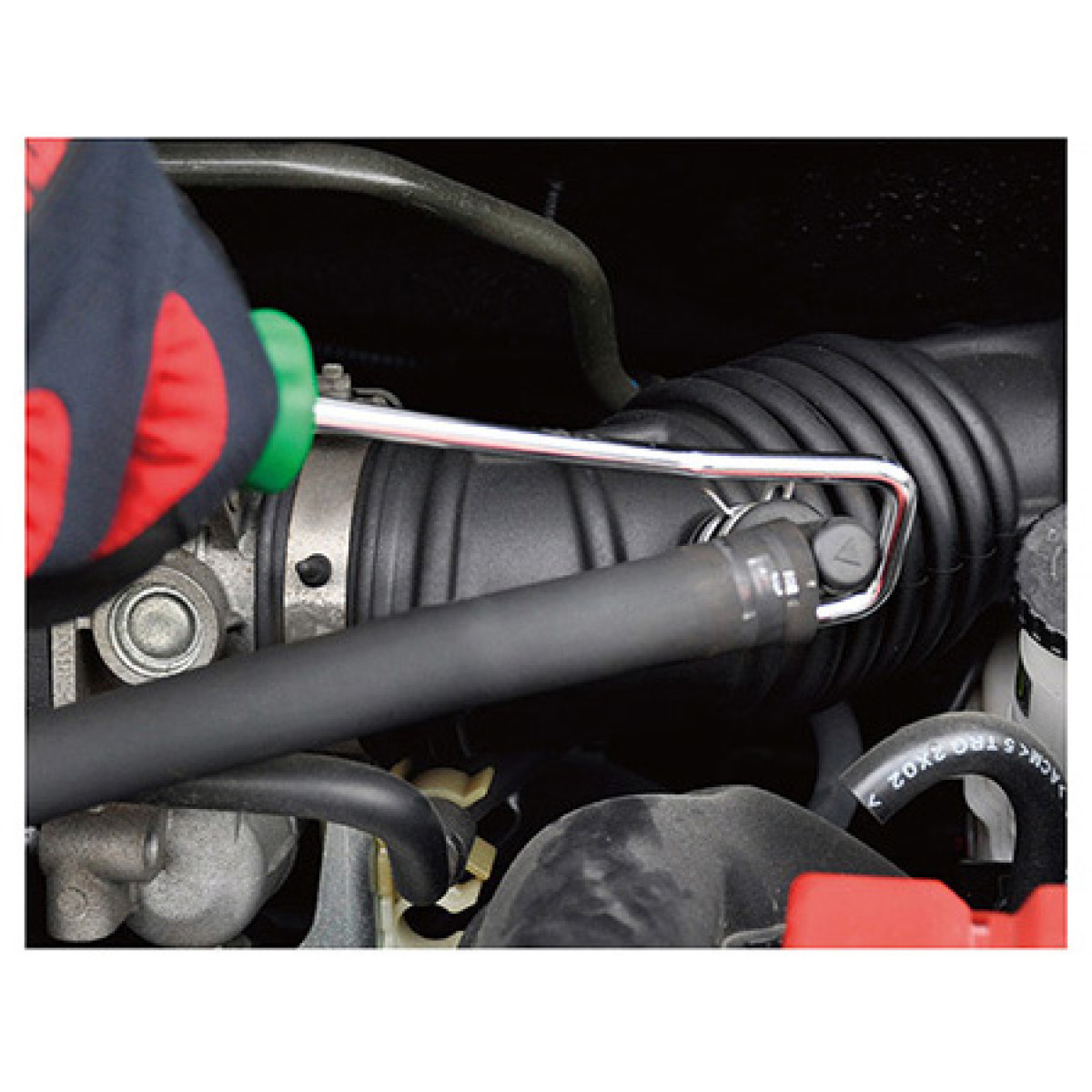 Знімач призначений для зручного та безпечного зняття патрубків радіатора під час технічного обслуговування автомобіля. Інструмент дозволяє легко відокремлювати патрубки системи охолодження без їх пошкодження, що особливо важливо під час ремонту або заміни елементів системи. Конструкція інструмента забезпечує надійну фіксацію патрубка та використання важільного принципу, що дозволяє прикладати необхідне зусилля для легкого від'єднання. Завдяки ергономічній рукояті інструмент зручний у використанні та підходить як для професійного застосування в автосервісах, так і для використання автолюбителями під час самостійного обслуговування автомобіля.