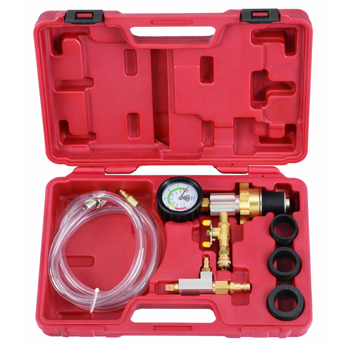 Пристосування для заміни охолоджувальної рідини призначене для вакуумного відкачування повітря з радіатора та системи охолодження автомобіля. Вакуумний пристрій використовується для заправки радіатора охолоджувальною рідиною без утворення повітряних пробок. Інструмент дозволяє виключити потрапляння повітря в систему, що забезпечує правильну циркуляцію рідини та стабільну роботу системи охолодження. Набір оснащений адаптерами, які підходять для більшості сучасних автомобілів, тому може використовуватися як у професійних автосервісах, так і для особистого використання.