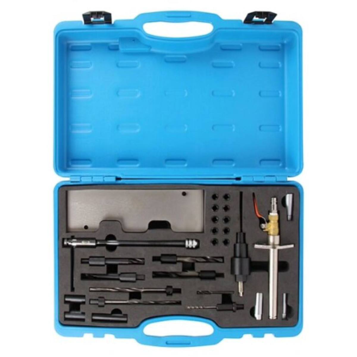 Професійний набір із 28 предметів призначений для ремонту та відновлення різьби свічок накалювання без необхідності знімати головку блоку циліндрів. Набір забезпечує точне свердління, нарізання та очищення різьби, а також дозволяє швидко та безпечно видалити пошкоджені або зірвані свічки.