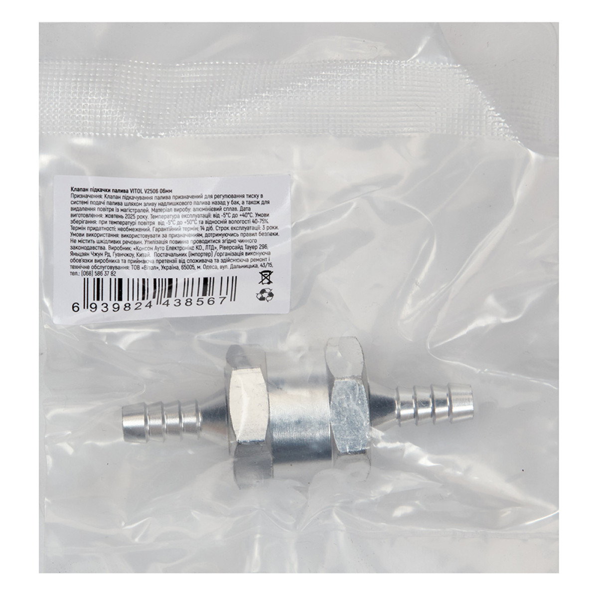 клапан підкачки палива VITOL V2506, зворотний клапан 6 мм, паливний клапан алюмінієвий, клапан для бензину 6 мм, обратный клапан топлива 6 мм