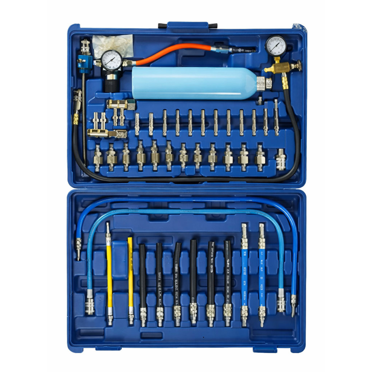 Комплект для чищення інжекторів призначений для очищення паливної системи інжекторних двигунів без демонтажу форсунок. Пристрій дозволяє ефективно видаляти відкладення та забруднення з інжекторів і паливної системи. Комплект оснащений необхідними насадками та перехідниками для підключення до паливної системи більшості автомобілів. Для очищення використовується спеціальна промивна рідина типу WINS або аналогічна.