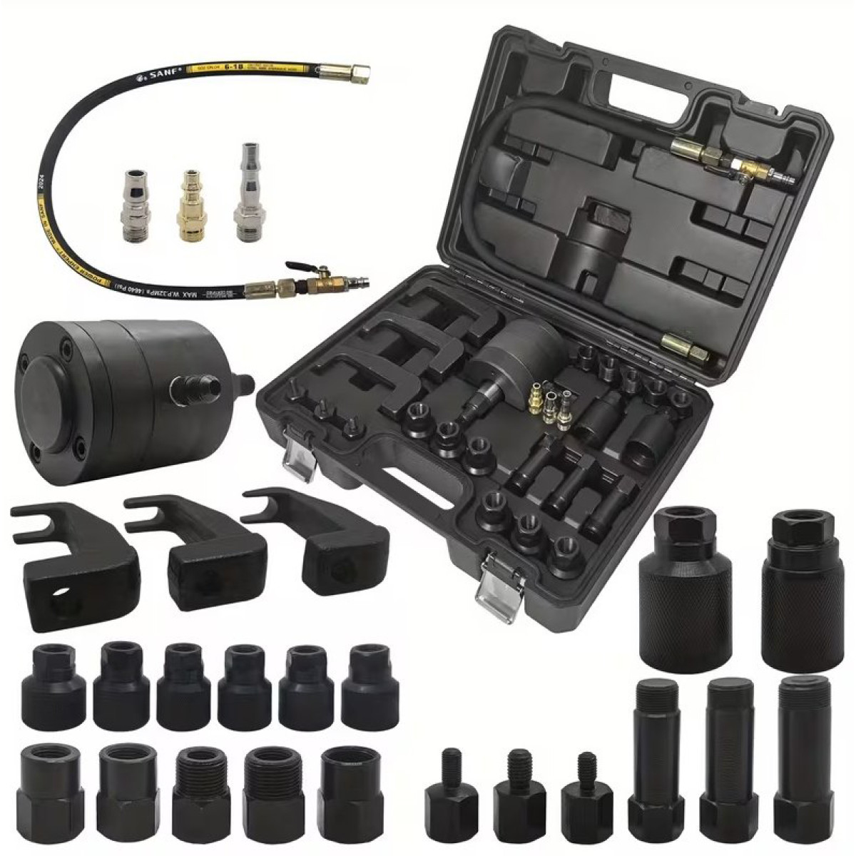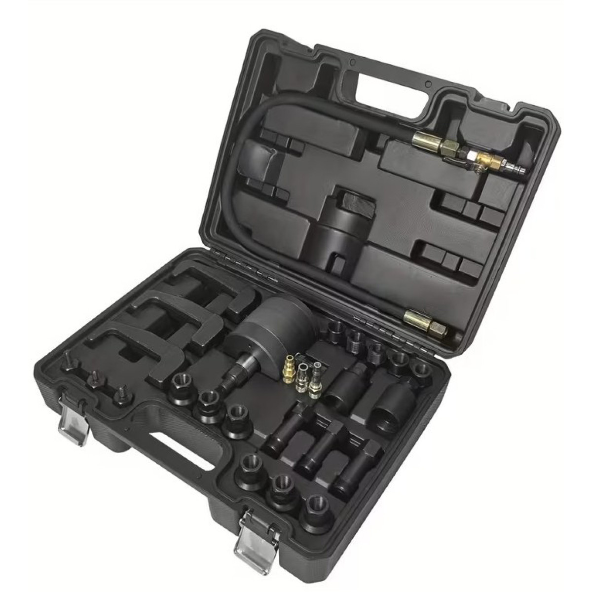Знімач призначений для демонтажу закипілих та прикипілих дизельних форсунок із використанням імпульсних пневматичних ударів. Такий принцип роботи дозволяє ефективно витягувати форсунки без пошкодження посадкових місць і головки блоку циліндрів. Інструмент підключається до джерела стисненого повітря з робочим тиском 5–8 бар. У комплект входить універсальний набір адаптерів, що забезпечує сумісність із 99% поширених дизельних форсунок.