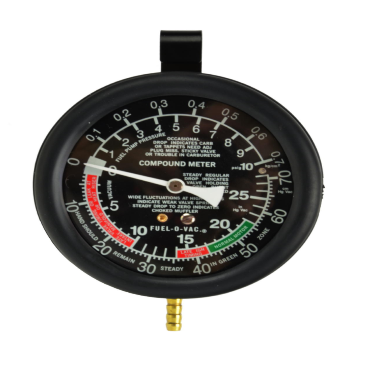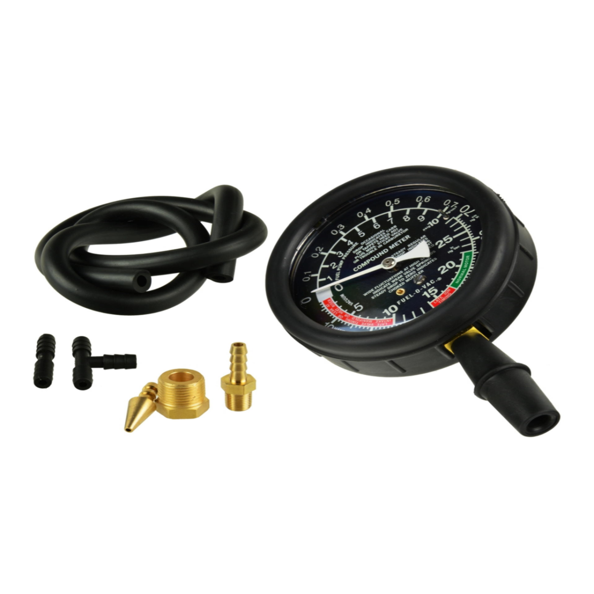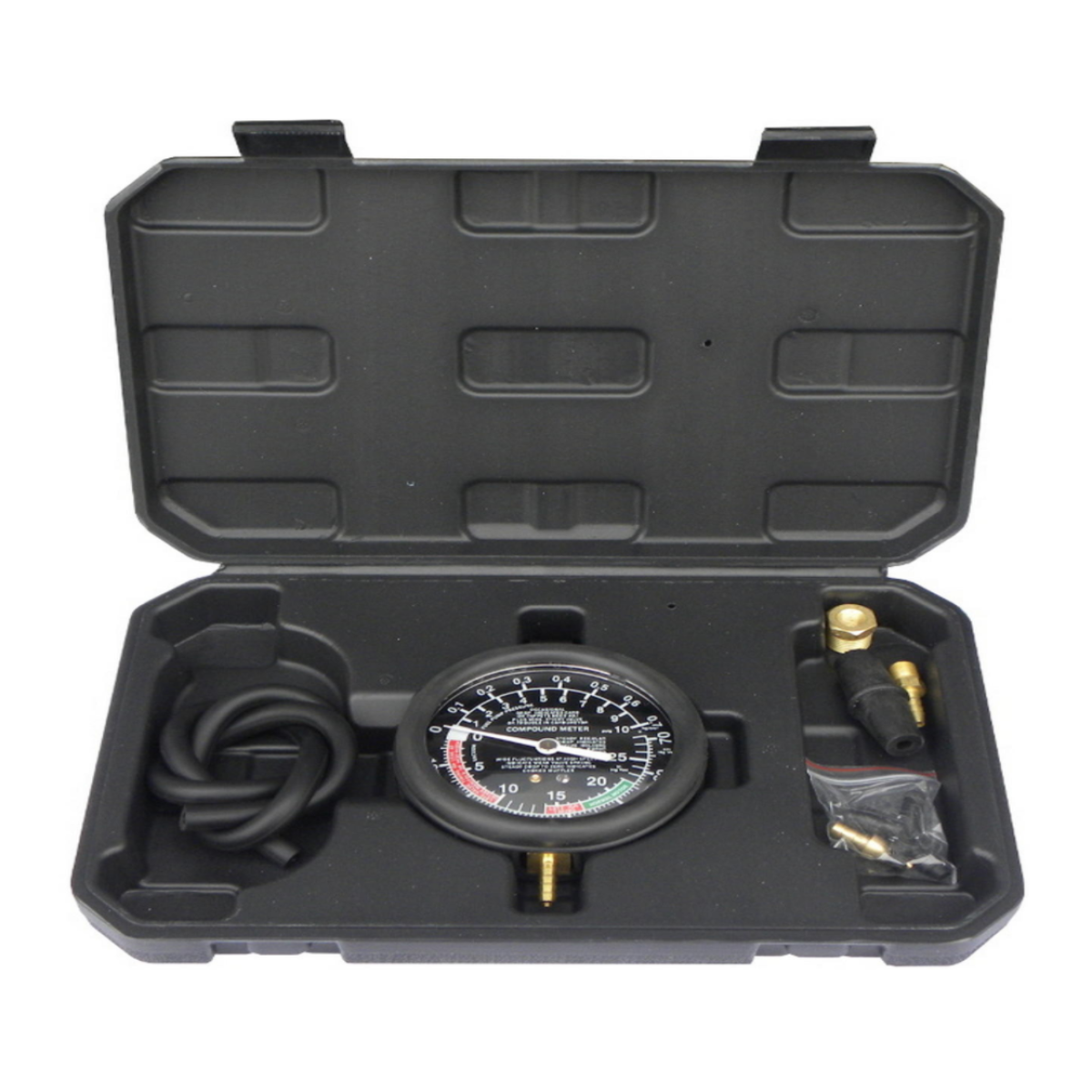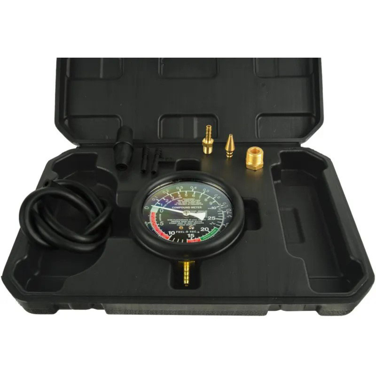 Тестер - вакуумний та паливний тестер (вакуумметр), призначений для перевірки тиску та вакууму в системах бензинових двигунів. Прилад дозволяє точно контролювати параметри роботи двигуна та швидко виявляти несправності системи впуску, запалювання і паливної системи. Манометр великого діаметра з кольоровою шкалою забезпечує зручне зчитування показників, а гнучкий шланг і комплект адаптерів дозволяють легко підключатися до різних вузлів двигуна. Тестер сумісний з більшістю транспортних засобів та використовується для перевірки вакууму у впускному колекторі, контролю роботи турбіни та діагностики паливної системи.
