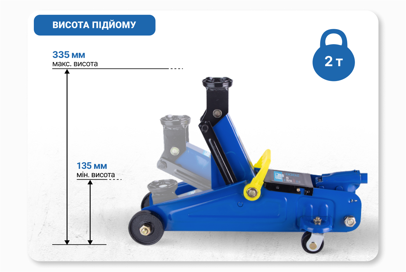 Домкрат підкатний (DP-20009K/T82000СS) фірми VITOL використовують у аматорській та професійній сфері на станціях техобслуговування. Підкатний домкрат (DP-20009K/T82000СS) має висоту близько 135 мм. При цьому максимальна висота підйому 335 мм, це дозволяє працювати з легковими авто. Домкрат має гарну стійкість під час роботи. Має повротну ручку