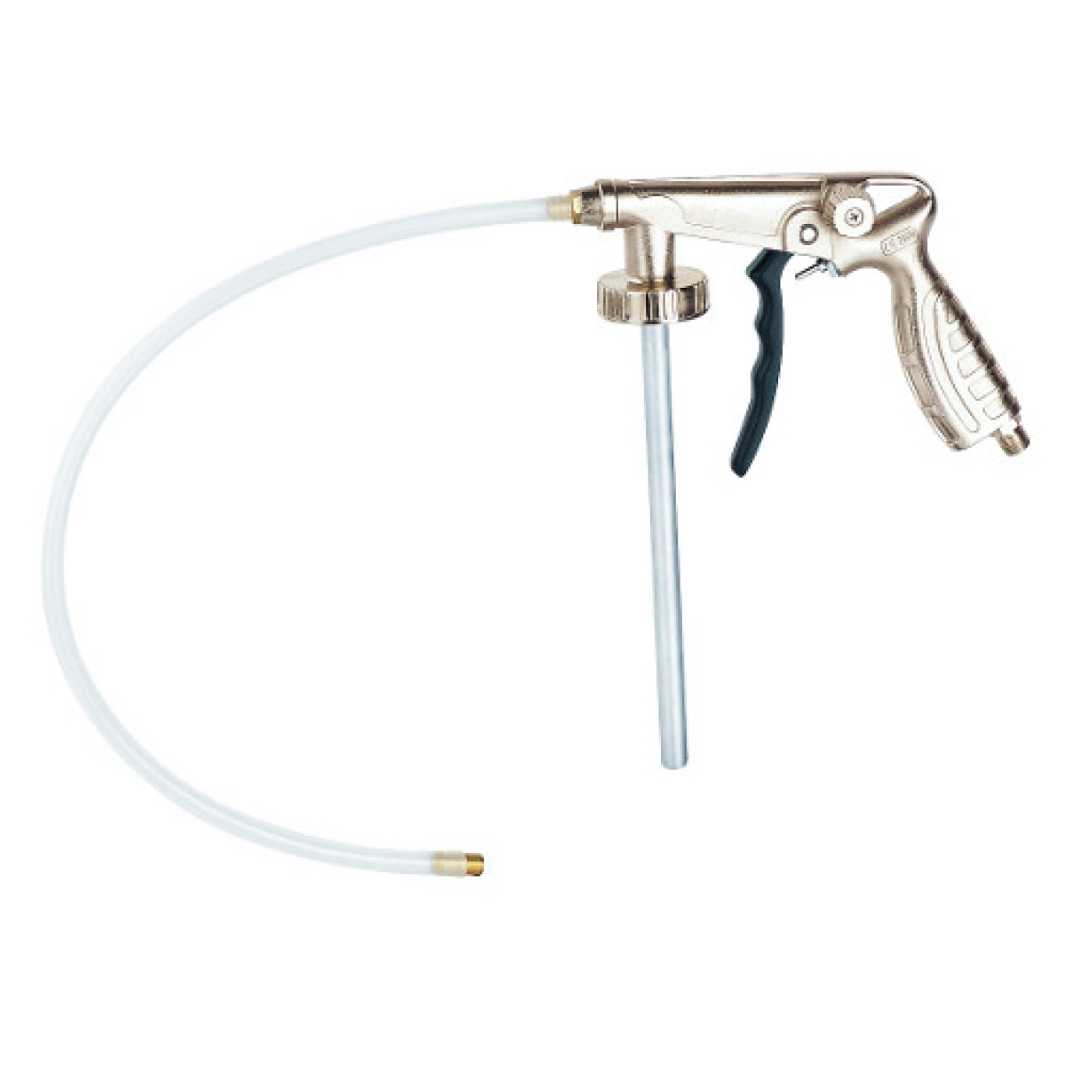 Пневматичний пістолет призначений для нанесення антигравійних і антикорозійних покриттів на кузовні елементи автомобіля. Завдяки гнучкій насадці забезпечує зручну обробку важкодоступних місць і рівномірне покриття навіть на профільованих поверхнях. Інструмент простий у використанні, стійкий до навантажень і підходить як для професійних майстерень, так і для побутового застосування.