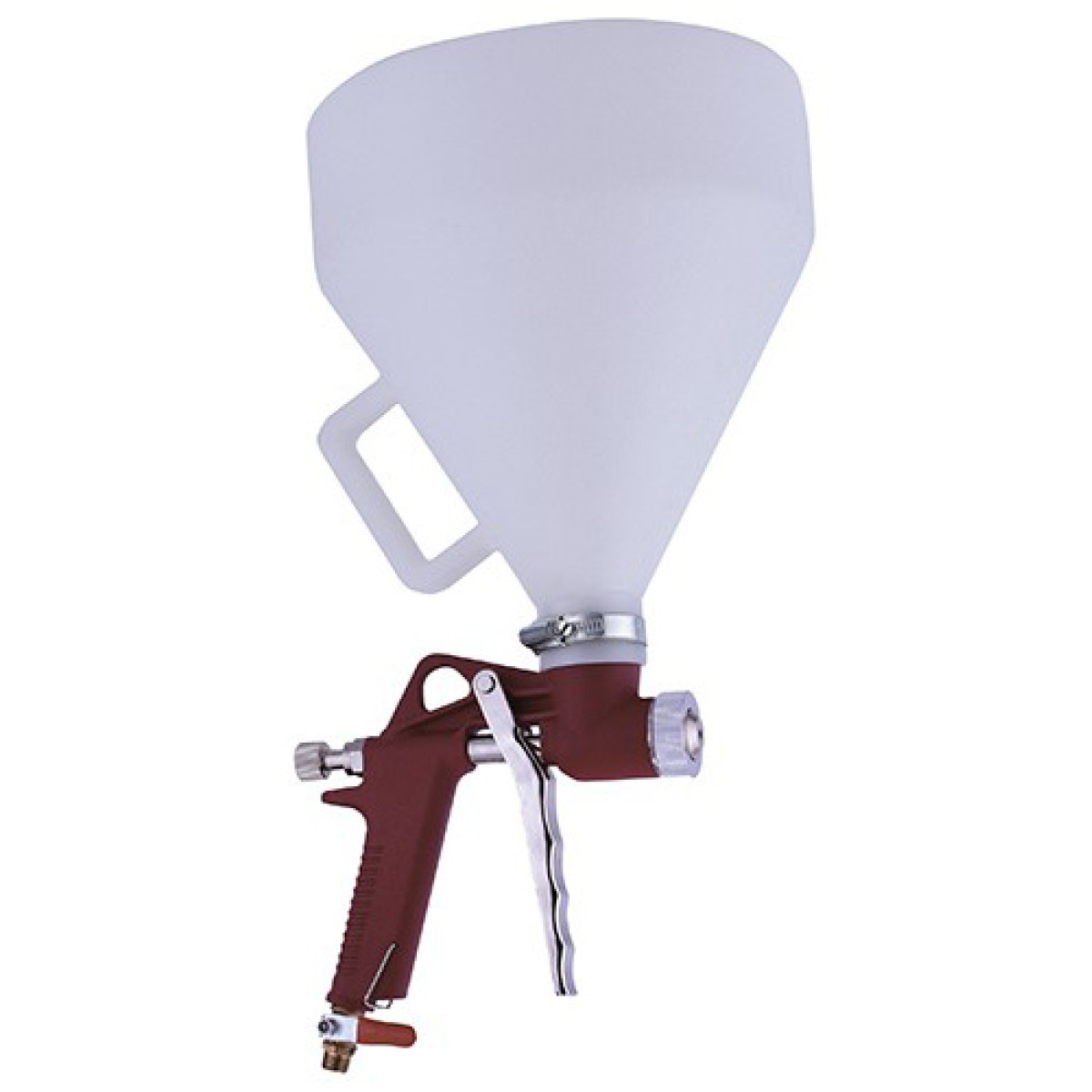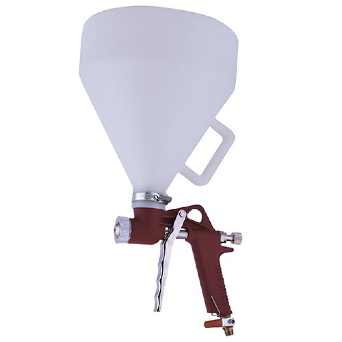 Пневматичний розпилювач із верхнім пластиковим бачком об’ємом та форсункою призначений для швидкого та рівномірного нанесення штукатурки, шпаклівки та декоративних складів. Найчастіше застосовується під час будівельних та оздоблювальних робіт. Модель оснащена зручним краником для перекриття потоку повітря, що полегшує зміну місткості бачка та забезпечує комфорт у роботі. Завдяки високому робочому тиску та великій витраті повітря інструмент дозволяє ефективно обробляти великі площі за мінімальний час.