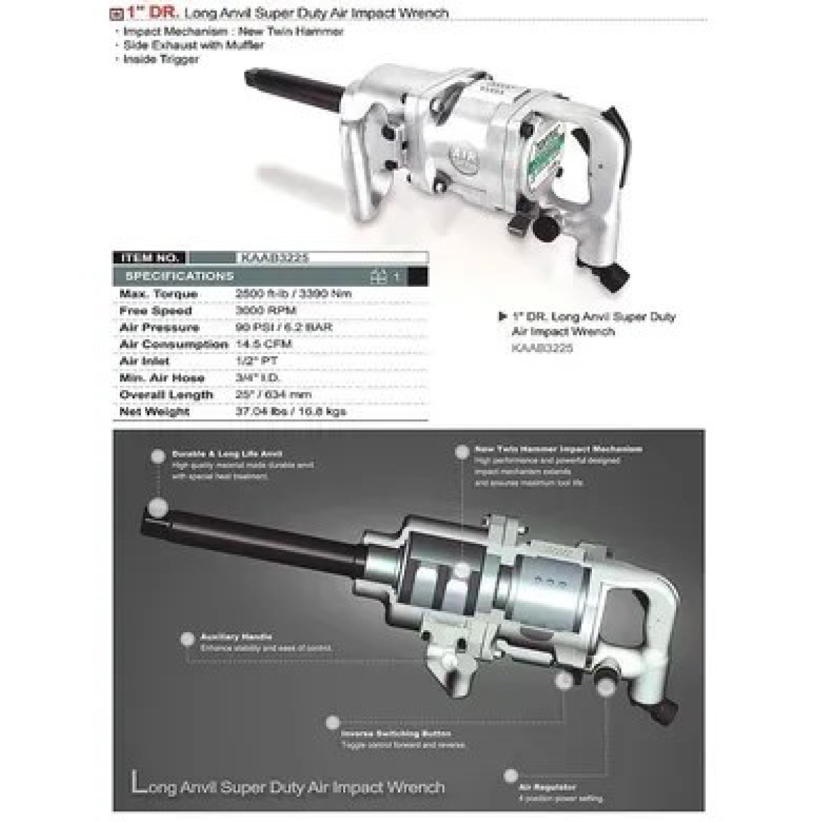 Гайковерт пневматичний належить до професійного класу пневмоінструментів. Вирізняється стійкістю до високих навантажень, надійністю та довговічністю. Завдяки потужності і швидкості обертання інструмент широко застосовується на СТО, у автомайстернях та на промислових підприємствах. Модель оснащена ударним механізмом , який забезпечує стабільну роботу навіть за інтенсивного використання. Виробник - надійна торгова марка з Тайваню.