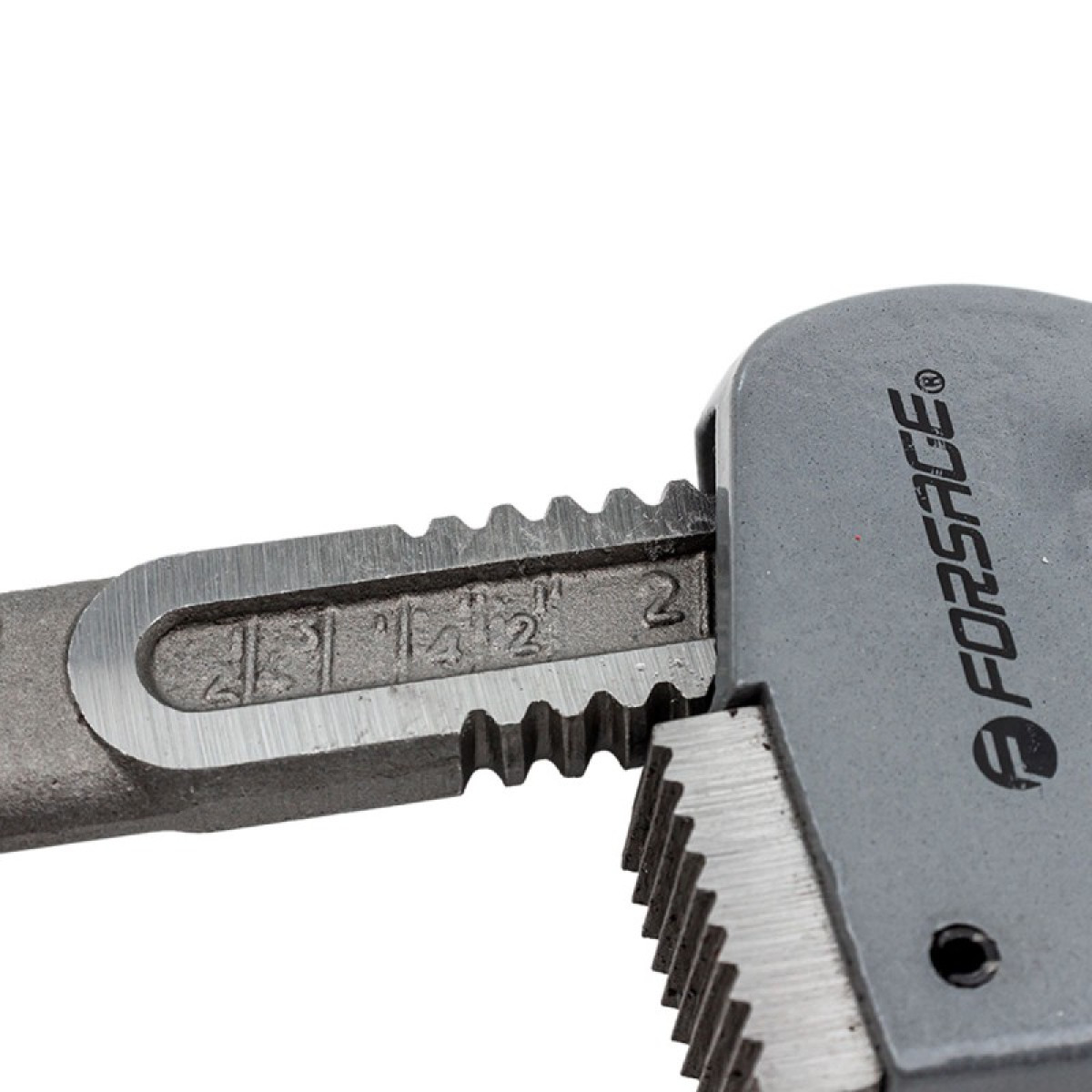 FRSG F-68414 - універсальний трубний розвідний ключ, призначений для обертання або фіксації труб та деталей різної форми. На відміну від звичайних ключів, трубний ключ щільно обтискає деталь, тому не вимагає наявності шліців або фасок. Легка алюмінієва конструкція робить інструмент зручним для тривалої роботи.