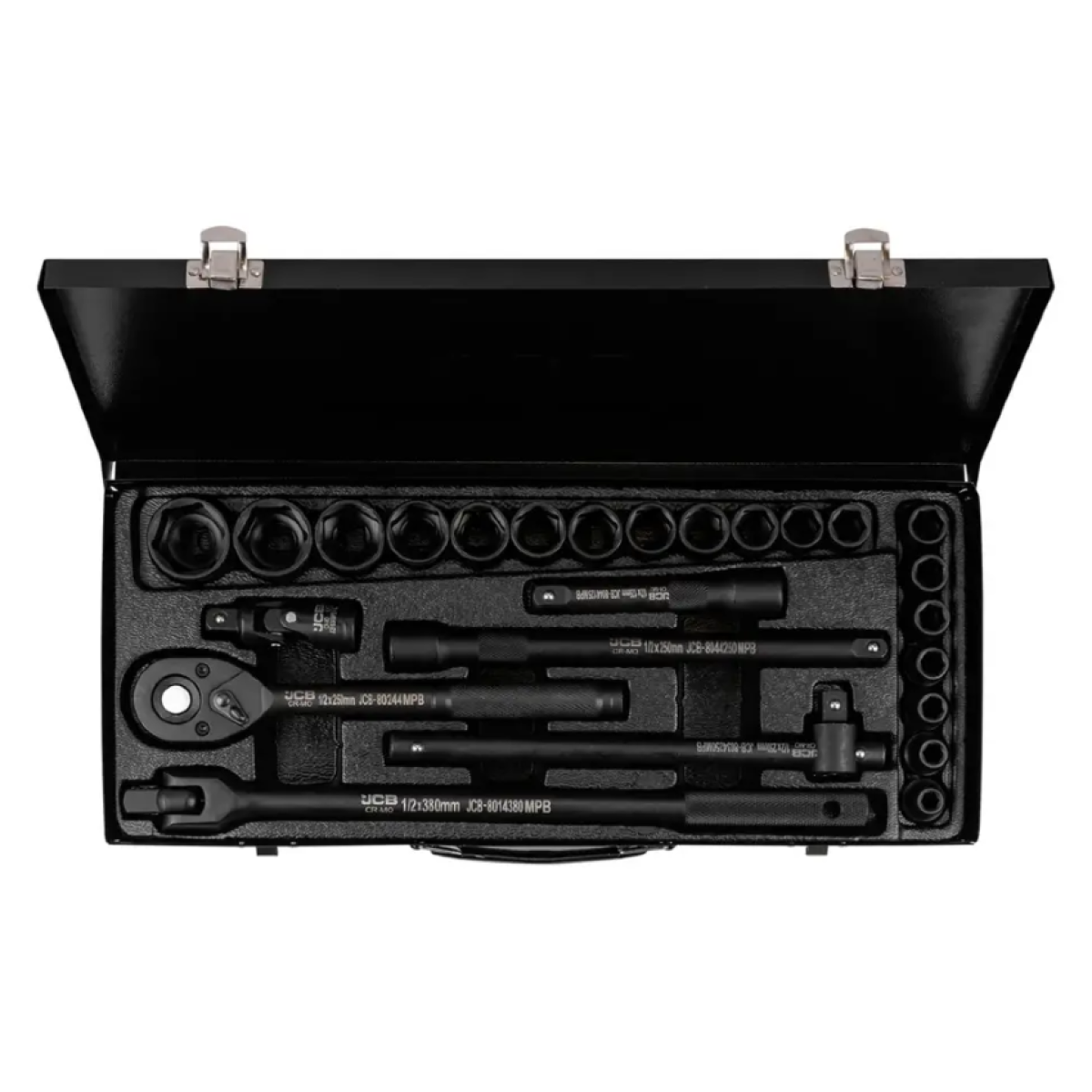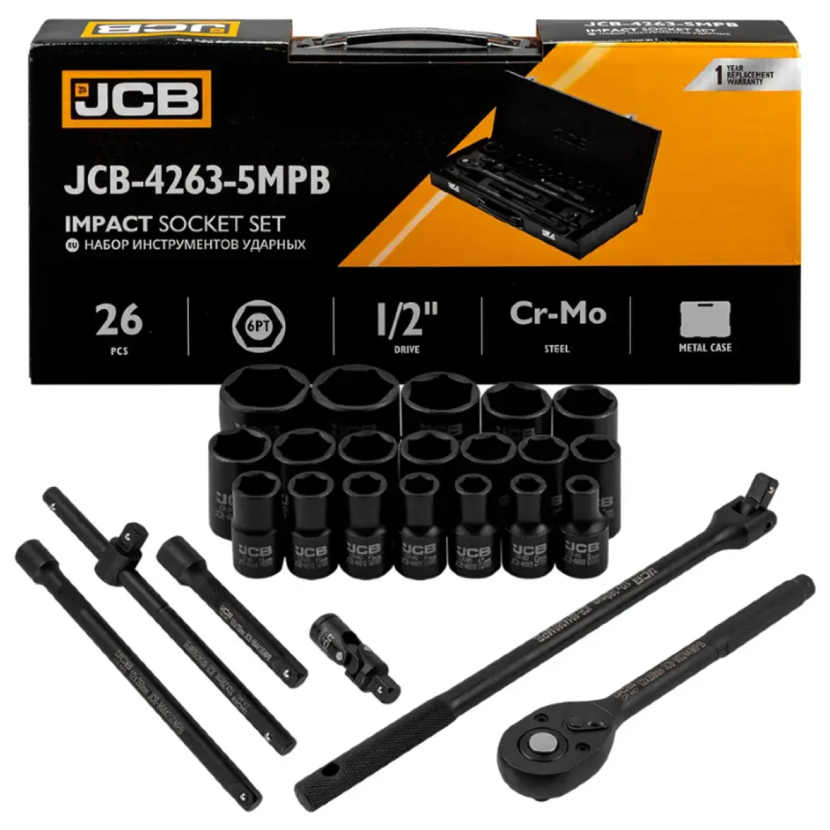 набір ударних інструментів, JCB-4263-5MPB, JCB Tools, набір ударних головок, набір 1/2 дюйма, набір у металевому кейсі, набір для СТО, Cr-Mo інструмент, набір тріскачка вороток подовжувач, ударний набір JCB, професійний набір інструментів