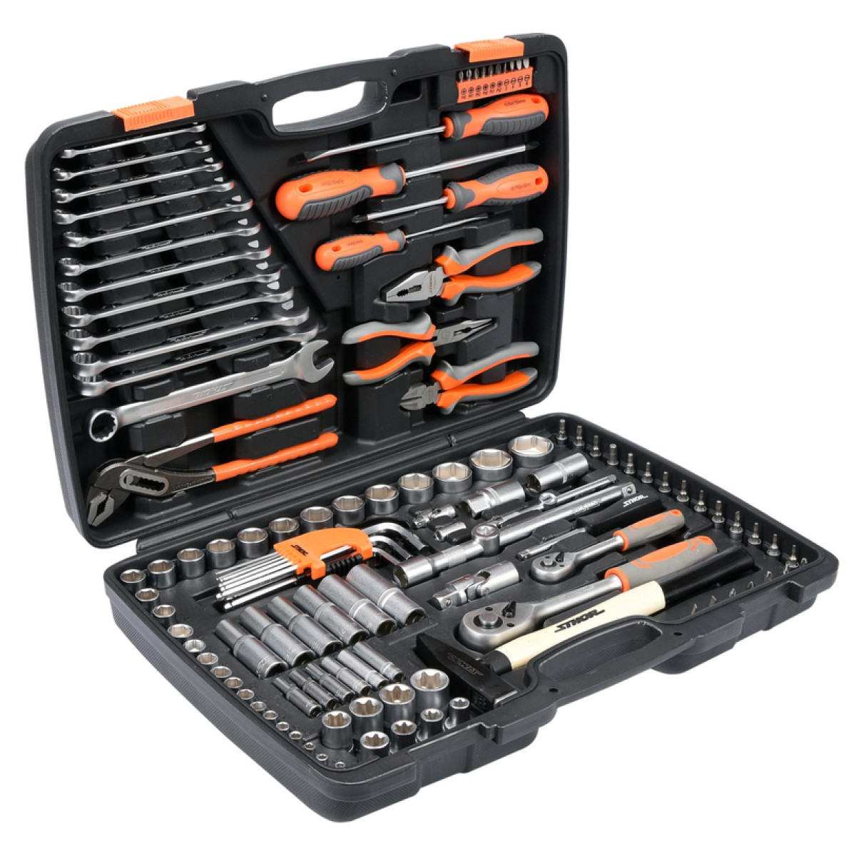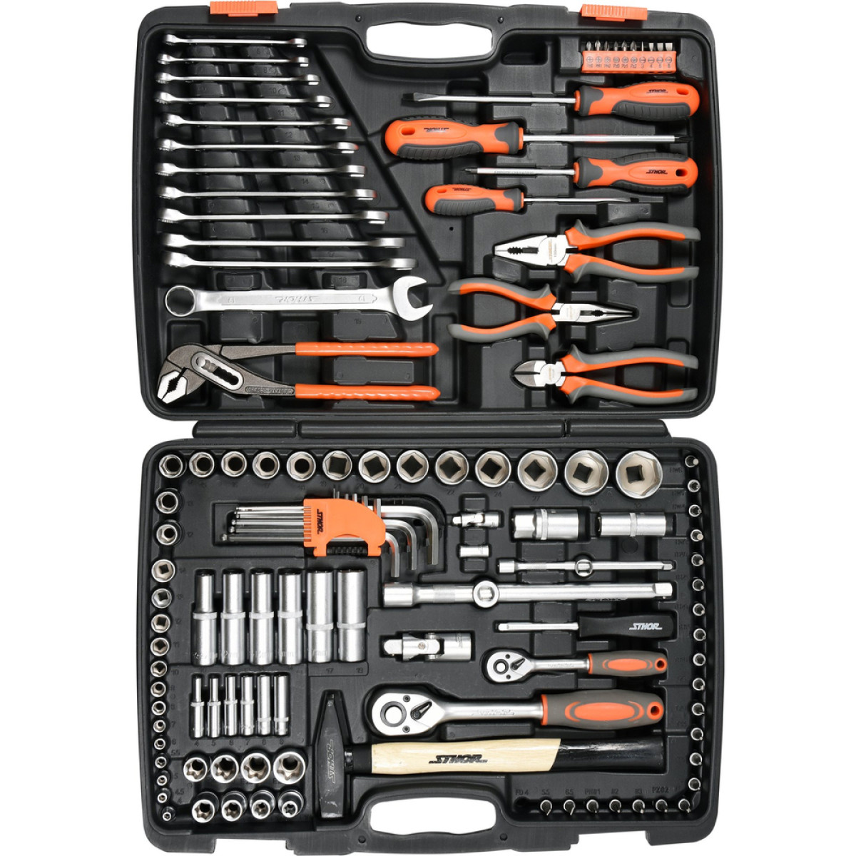 набір інструментів STHOR 58690, універсальний набір 122 предмети, набір з тріщатками та ключами, інструментальний набір для авто, професійний інструмент STHOR