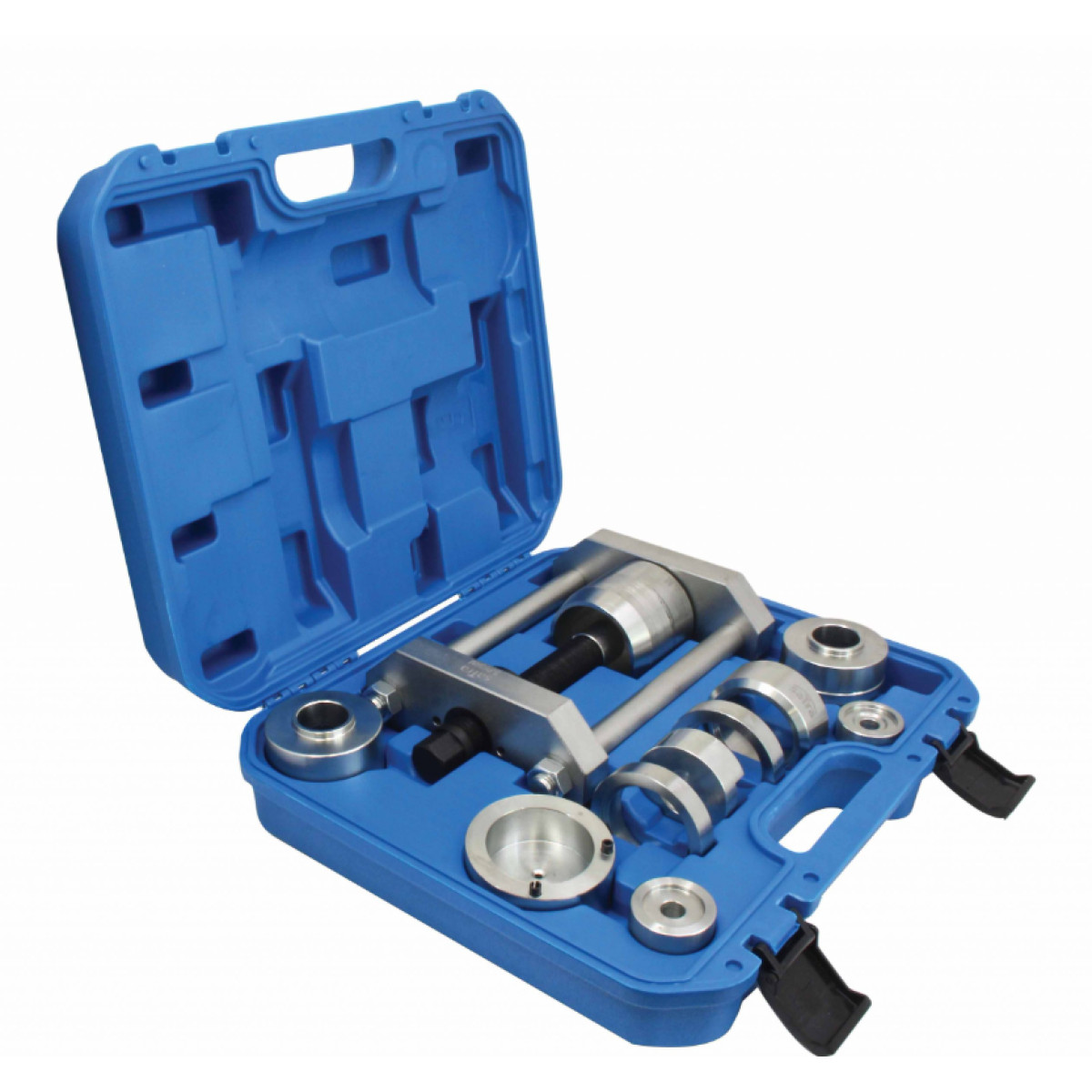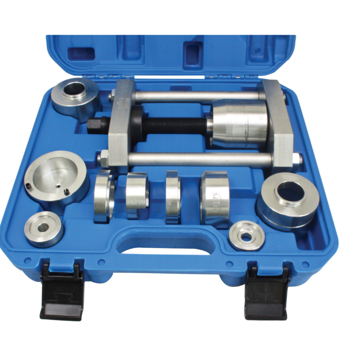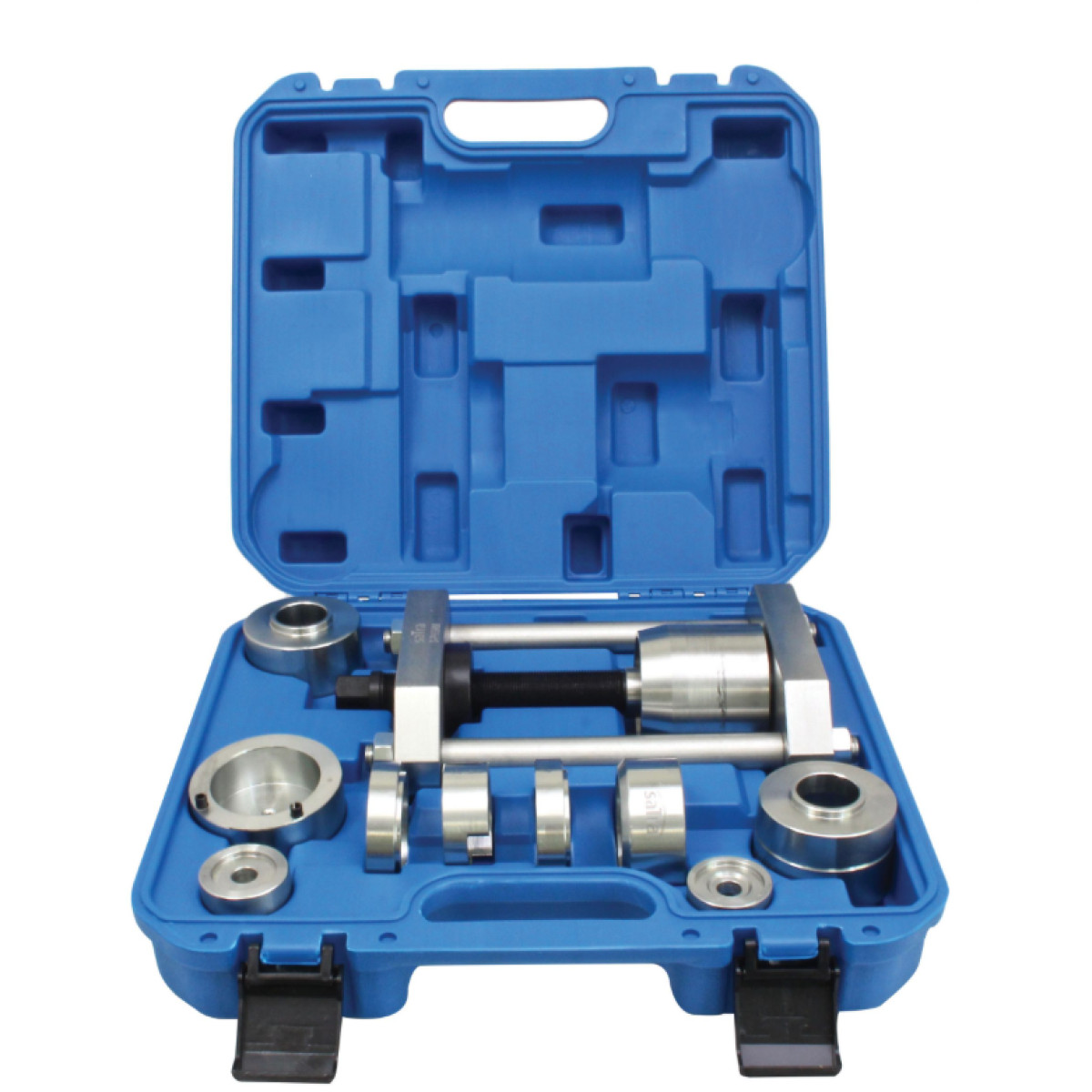 SATRA S-P9SRM — професійний комплект, призначений для демонтажу та встановлення штифтів і сайлентблоків важелів підвіски без необхідності повного зняття компонентів автомобіля. Завдяки адаптерам у комплекті знімач підходить для широкого кола розвізних транспортних засобів.