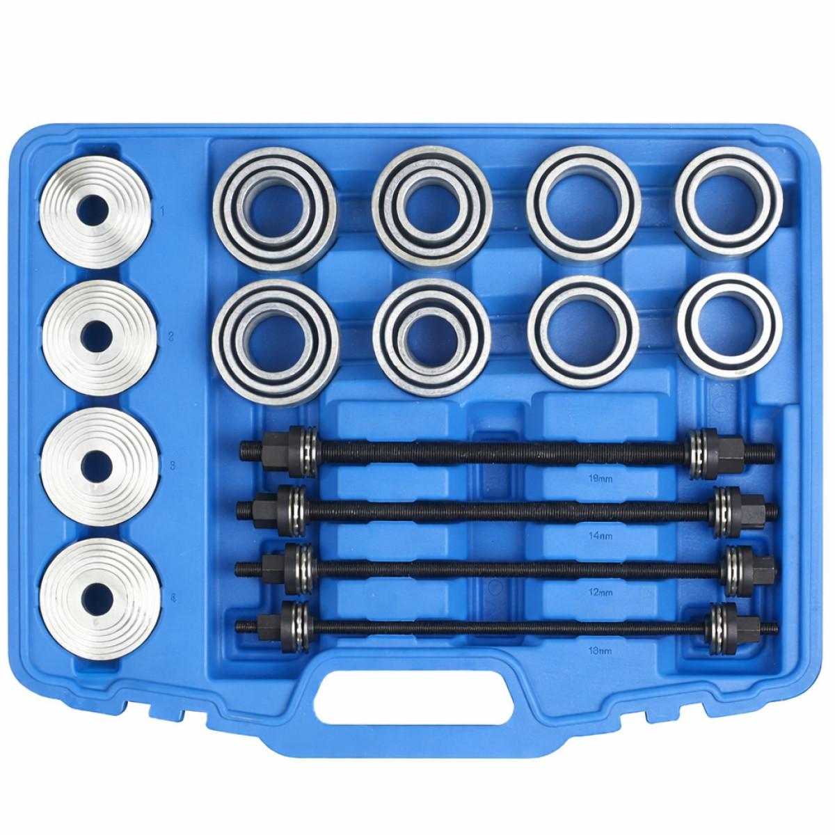 Набір містить гільзи з внутрішнім і зовнішнім діаметром у широкому діапазоні, що забезпечує універсальність застосування. Рекомендований для професійного використання в автосервісах і майстернях.